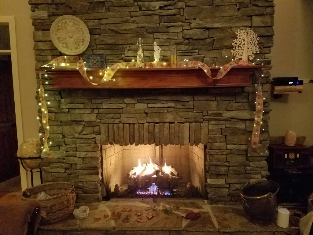 The two focal points were the fireplace mantle and hearth and the dining room table. We draped them both in gorgeous ribbon spiraling with autumn leaves and colors, and warm white faery lights. We removed amenities from boxes and tied them in ribbons. Each guest would receive a warm autumn throw in which to wrap themselves on these cold nights, a goblet adorned with swirling fall leaves with their names painted on the stems, and a handwritten note of gratitude for their presence in my life.