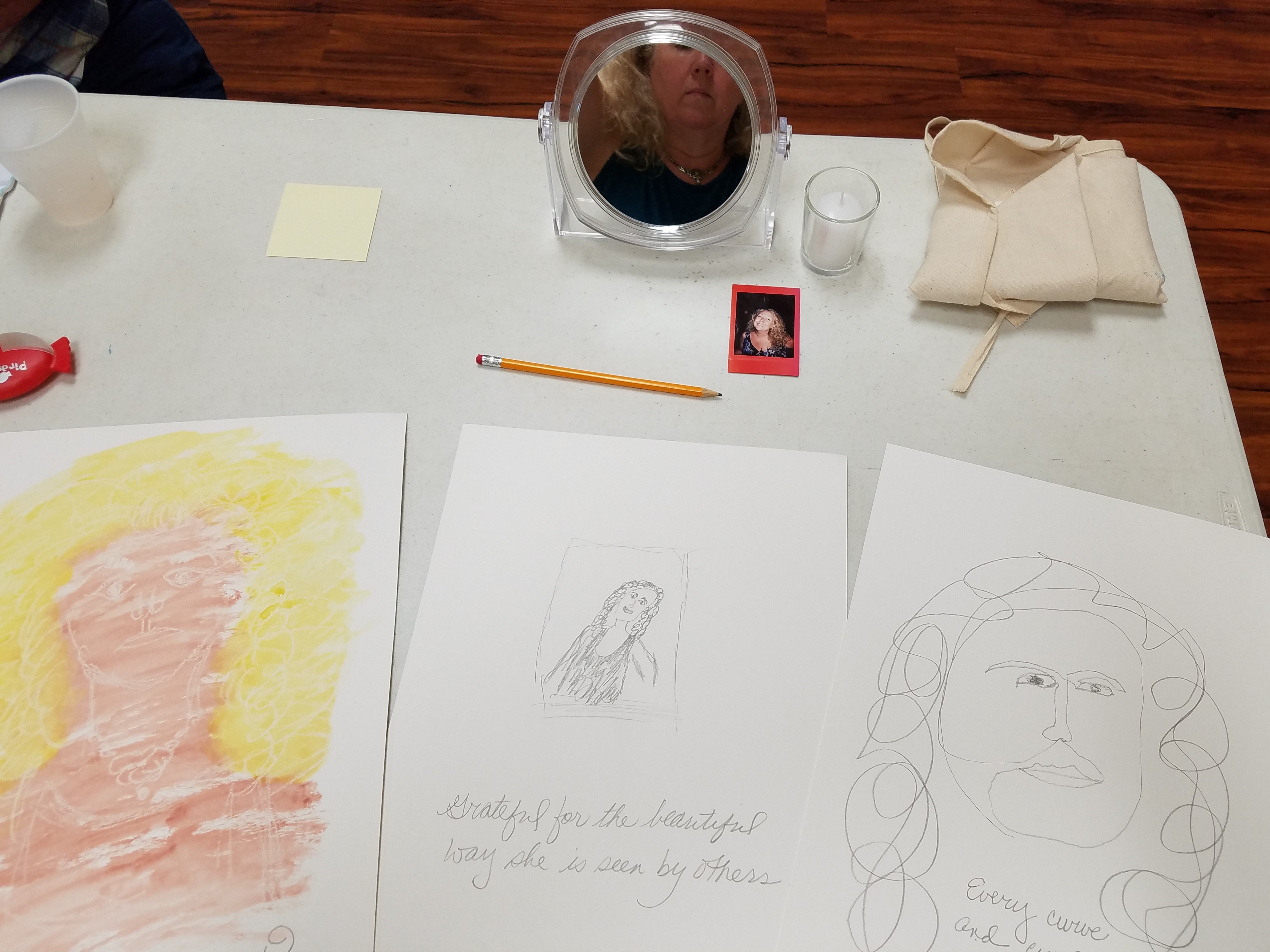 For our final art project, we were presented with three pieces of paper, a white crayon, a pencil, a set of watercolor paint, a candle, and a mirror. We were shown three ways to create our own self-portrait, and instructed to create, then write words to go with each art piece. Talk about intimidated! I could feel Mr. Veblin (my elementary art teacher) over my shoulder ready to judge. But you know what? He wasn’t mean at all. He was there to support me. He didn’t say a word, so not to frighten me with his booming voice. He simply held space for me. And guess what else! I didn’t hate the results. I mean… I am not growing into an artist of any skill… but I do believe I am growing into a woman of greater courage.