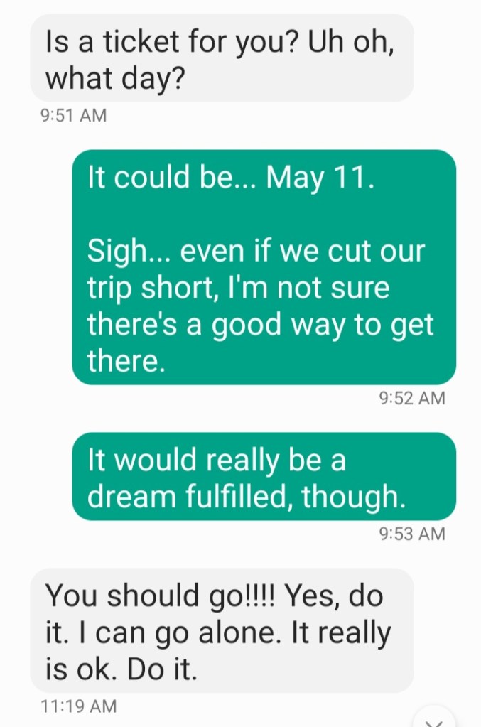 At this point, my heart was already overwhelmed. My immediate thought about receiving this much goodness all at once was to wonder if I had done enough to deserve it. Could this really be happening? One dear friend had offered me a gift, and another dear friend offered me forgiveness, encouragement, and support. Meanwhile, as I began to figure out how to get there, a third dear friend arrived to make it happen. She is a flight attendant who just so happened to be flying to Denver two days before the big event (only 12 days away, at this point). She booked my flights and would hold my hand (figuratively) there and back again.